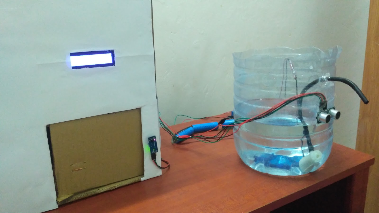 If you want to wash your hands, place your hands within 15 cm from the ultrasonic sensor. According to my Arduino program, this will switch on the relay module. The submersible water pump is connected to the relay module and an external power supply. The external power supply can be adjusted to provide the appropriate voltage. The water pump is switched on and the water is pumped from the container to your hands through a tube, which is modelled as the faucet in this prototype.After washing your hands, place your hand in front of the IR tracking sensor. The IR sensor sends a LOW signal when an object is detected within 2cm. The LOW signal makes the servo motor to rotate 90° and open the door (in this model). The door will automatically close after 10 seconds.
